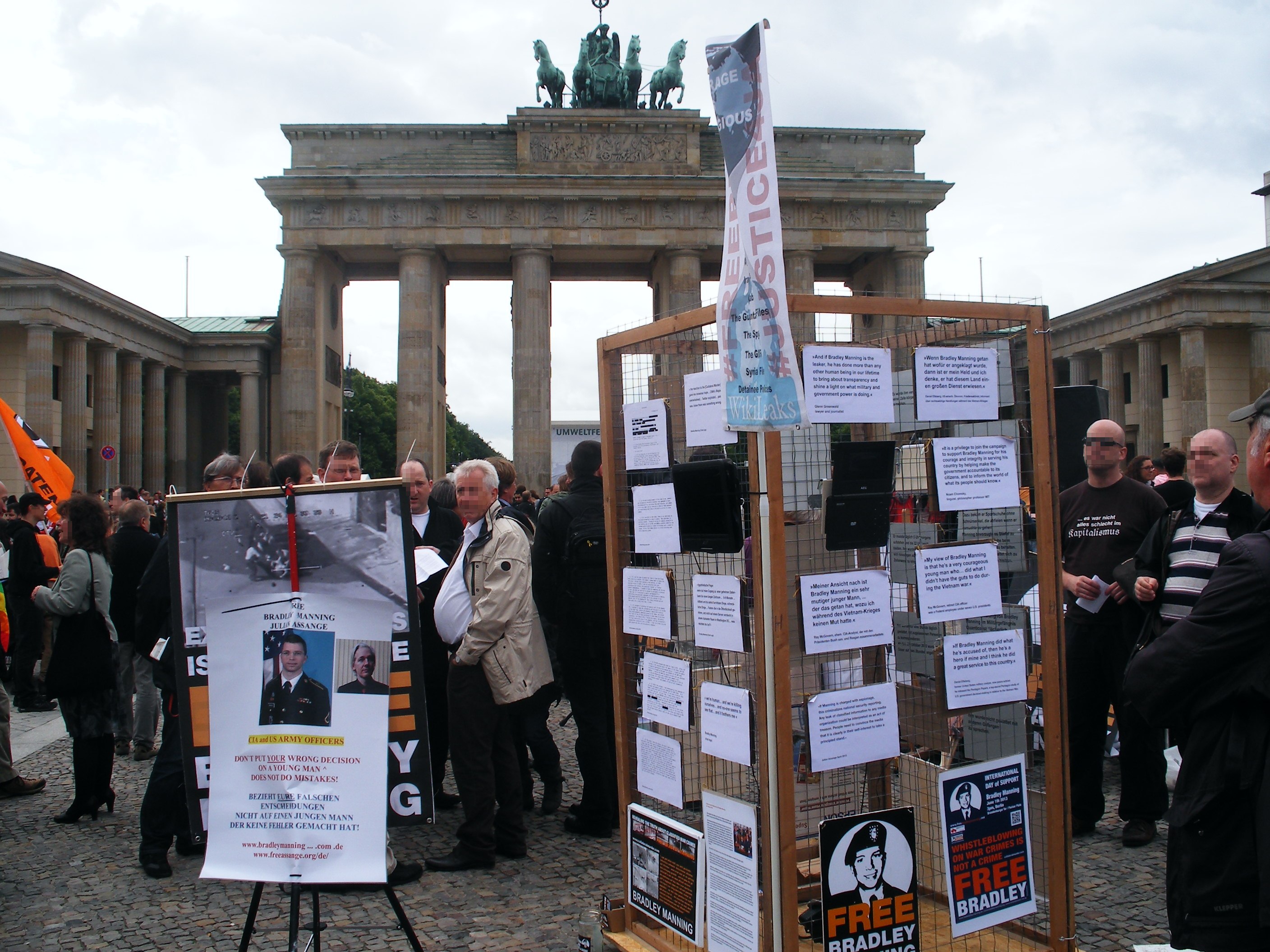 Über mehr als zwei Stunden wurden am Brandenburger Tor die Menschen über den Fall Bradley Manning aufgeklärt. Viele Redner brachten ihre Entrüstung über das Vorgehen der USA gegen den Soldaten Manning zum Ausdruck, der wegen "Unterstützung des Feindes" vor Gericht steht, weil er Kriegsverbrechen der USA im Irak öffentlich gemacht hat.