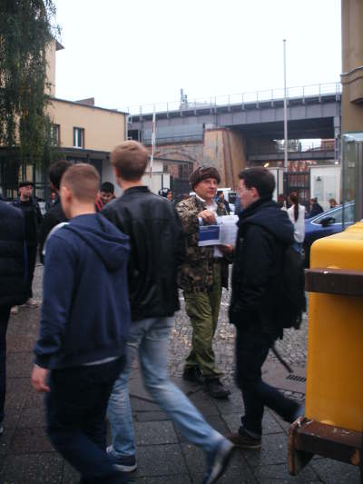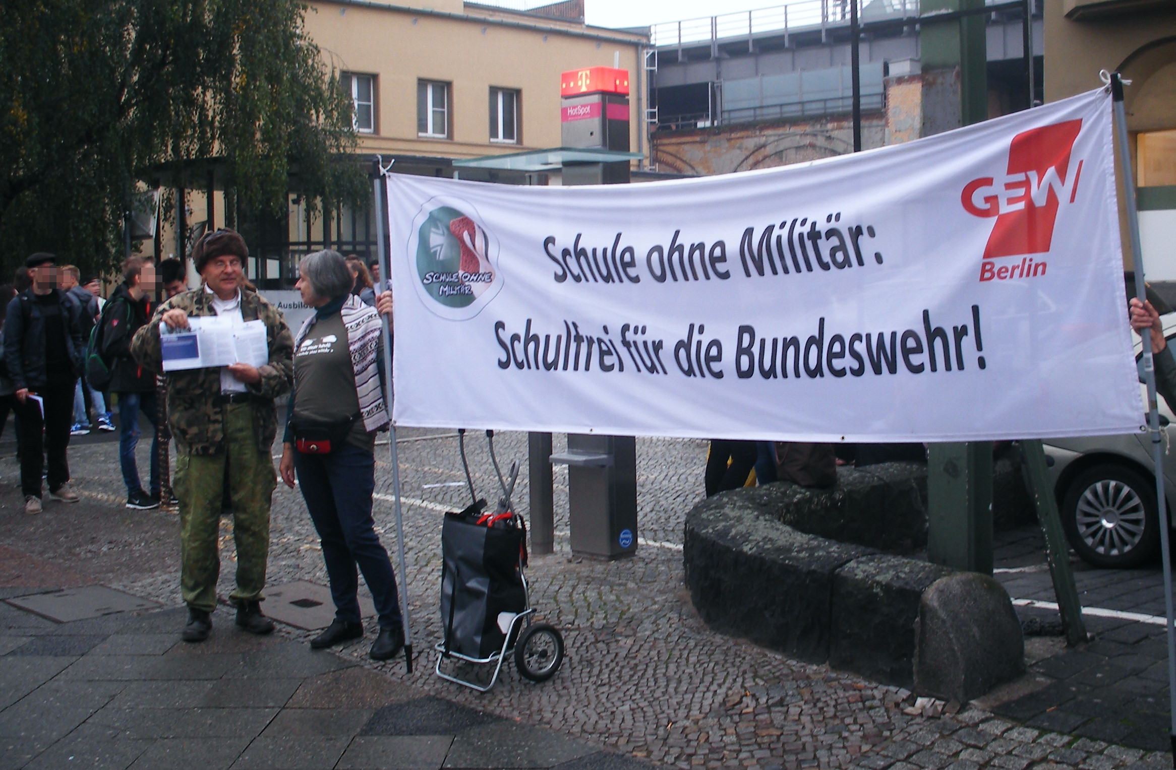 Deshalb waren wir mit dem Berliner Bündnis Schule ohne Militär mit 8 Aktiven ebenfalls da und konnten in kurzer Zeit über 700 Flyer verteilen in denen wir vor eine zweifelhaften Karriere bei der Bundeswehr warnen mussten.
