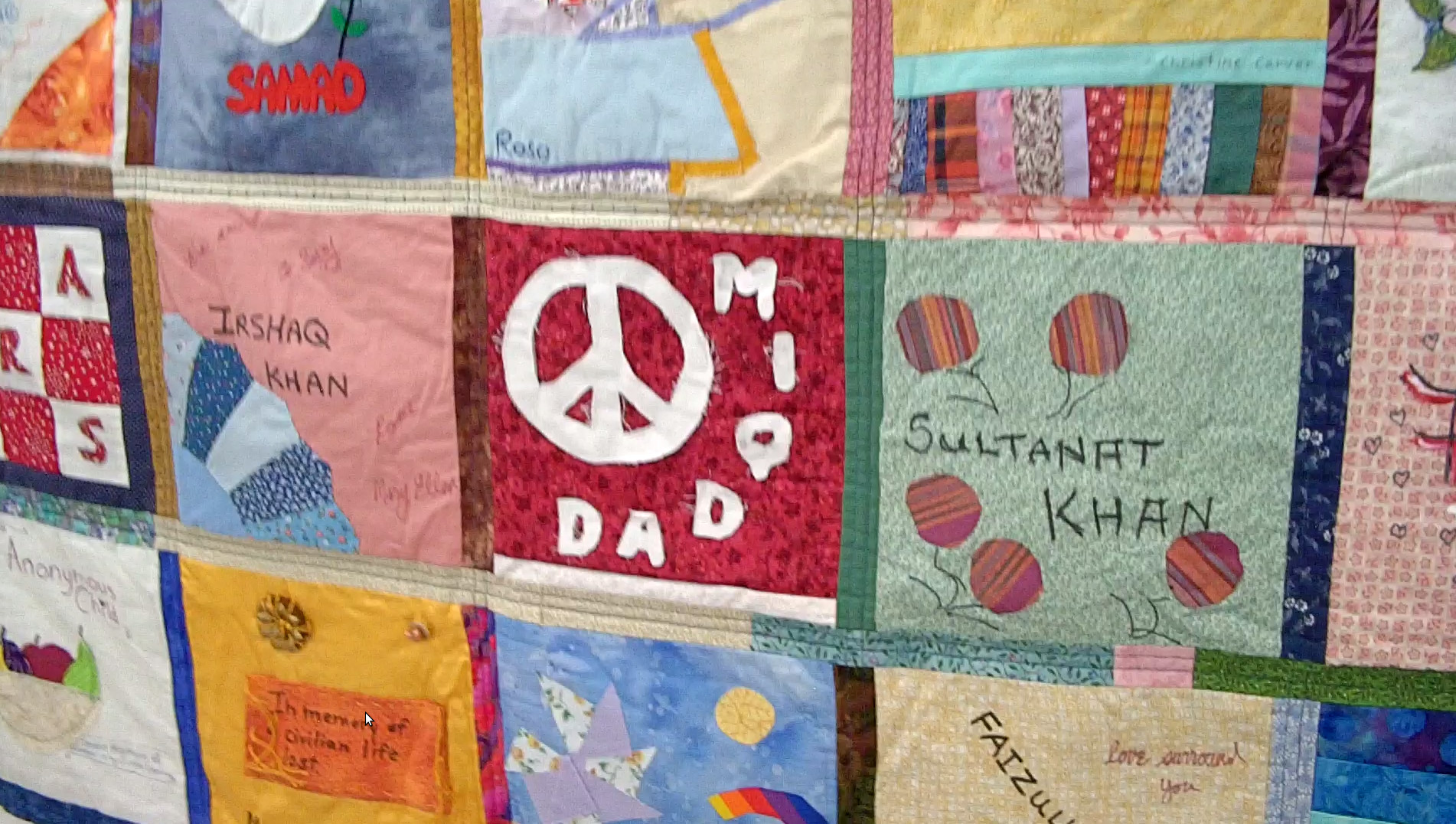 Die Idee für das Drohnen-Quilt Projekt kam von einer Gruppe Frauen in Großbritannien, die eine sogenannte "visuelle Petition" erstellen wollten, um sie dem Parlament vorzustellen. Diese wuchs mit Hilfe von US Bürgerinnen zu insgesamt 12 Decken mit jeweils 6x6 Feldern. Jedes Patchworkfeld erinnert an ein durch US-Drohnen getötetes Kind. Daneben gibt es Erläuterungen zum völkerrechtswidrigen Drohnenkrieg der USA.