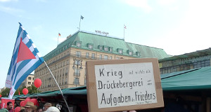 Rüstungsetat in soziale Projekte umleiten! Alle RednerInnen wiesen auch im Hinblick auf die gleichzeitig laufenden Landtagswahlen in Sachsen und Brandenburg darauf hin, dass wir eine erneute Hinwendung der Menschen zu solchen Wahnvorstellungen verhindern müssen. Dazu gehört es, dass wir das sogenannte 2% Ziel für den Rüstungshaushalt der Bundesregierung zurückweisen. Das sind nicht 2% des Bundeshaushalts sondern des BIP, also der gesamten Produktion Deutschlands, z.Zt. wären das ca. 75 Milliarden Euro, bei der beabsichtigten Zielerreichung 2026 wären es 80 Milliarden Euro. Lange Zeit betrug der Rüstungshaushalt um die 28 Milliarden, in diesem Jahr wurde er um 5 Milliarden gesteigert und für die nächsten Jahre sind weiter Steigerungen vorgesehen. Als Bedrohung wird uns Russland vorgehalten, dessen Ausgaben für das Militär im letzten Jahr gesunken sind. Das Verhältnis der Aufwendungen zwischen NATO und Russland liegt bei 963 zu 61 Milliarden $. Allein Frankreich gibt nach Angaben von SIPRI mehr für die Rüstung aus als Russland. Das Programm für den gestrigen Nachmittag 1. September Antikriegs-Weltfriedenstag 2019 Berlin, Pariser Platz Die Redebeiträge werden wir veröffentlichen, sobald sie uns zur Verfügung stehen. Dafür hier 2 Videos vom Antikriegstag in Hamburg: https://youtu.be/nOQ6wLhcHRA Hier die ersten Bilder vom Pariser Platz: