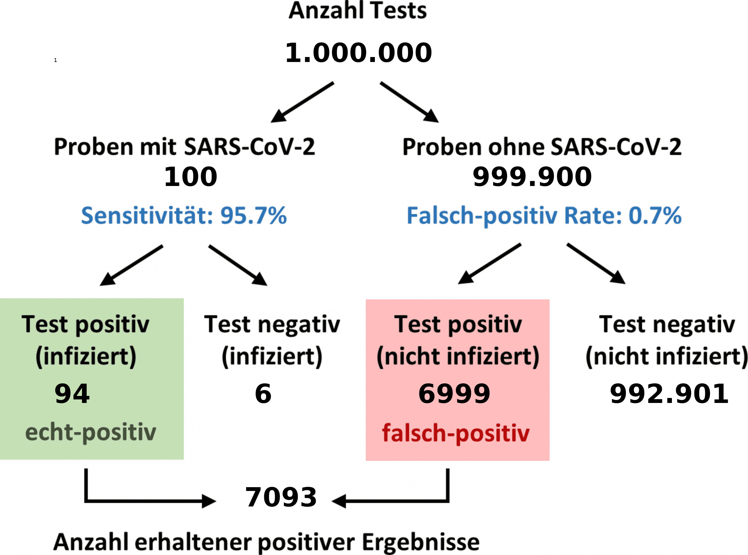 Ein PCR-Test mit der üblichen Falsch-Positiv-Rate von 0,7% findet in Proben OHNE das Virus 6999,3 falsch-positiv Getestete und richtigerweise 992.900 Nicht-Infizierte. In der Statistik tauchen dann jedoch 7094 positiv Getestete auf, obwohl es real nur 94 Test-Positive (infiziert) gibt.