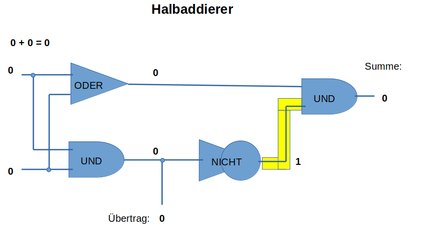 Wir wollen 0 und 1 addieren, das sind nur 4 mögliche Aufgaben: 0+0=0 1+0=1 0+1=1 und 1+1=10 , letzteres heißt wir haben einen Übertrag in die nächste Stelle erhalten, so wie wir es in unserem Zehnerzahlensystem erleben, wenn wir 9+1=10 berechnen.