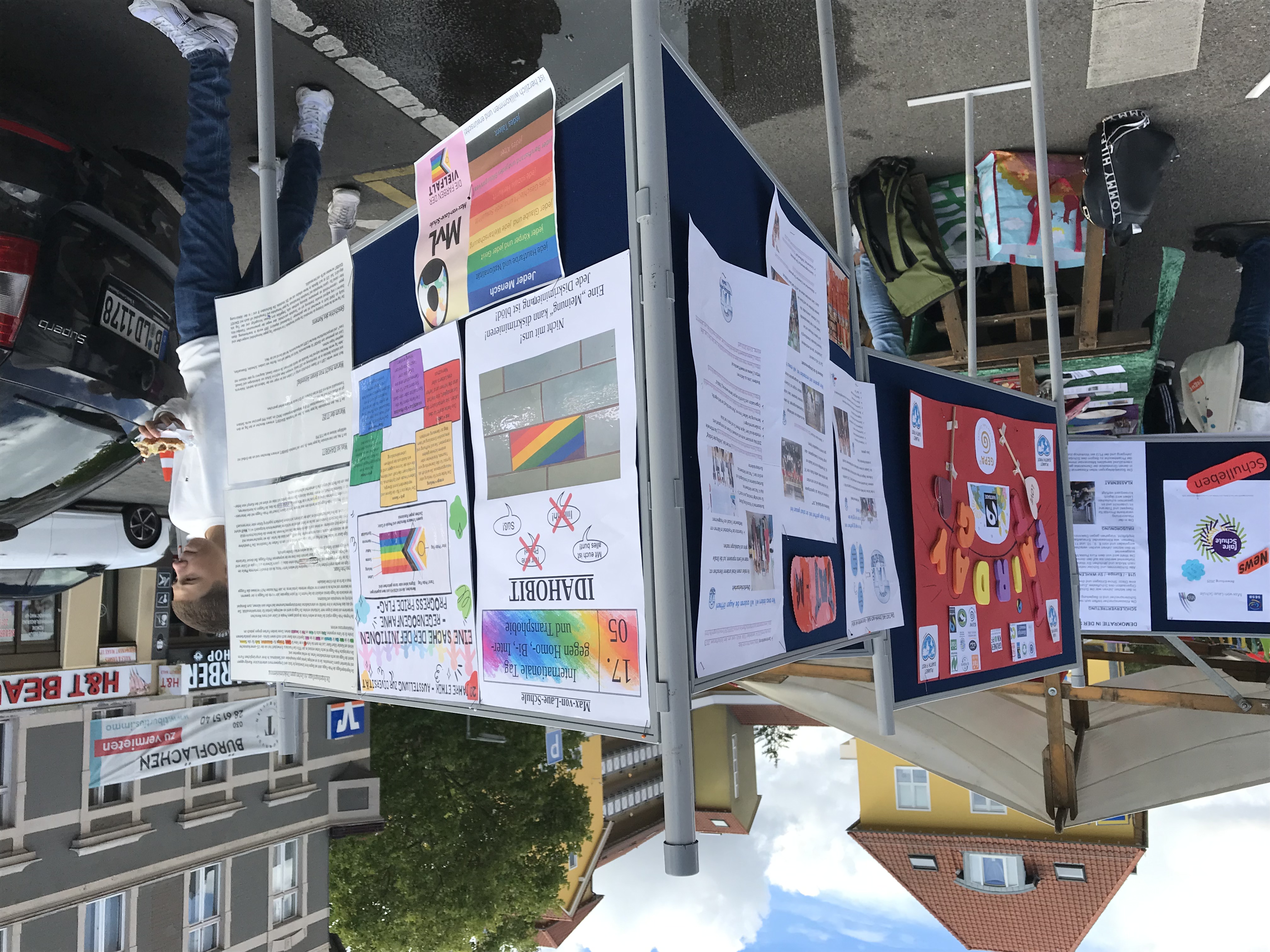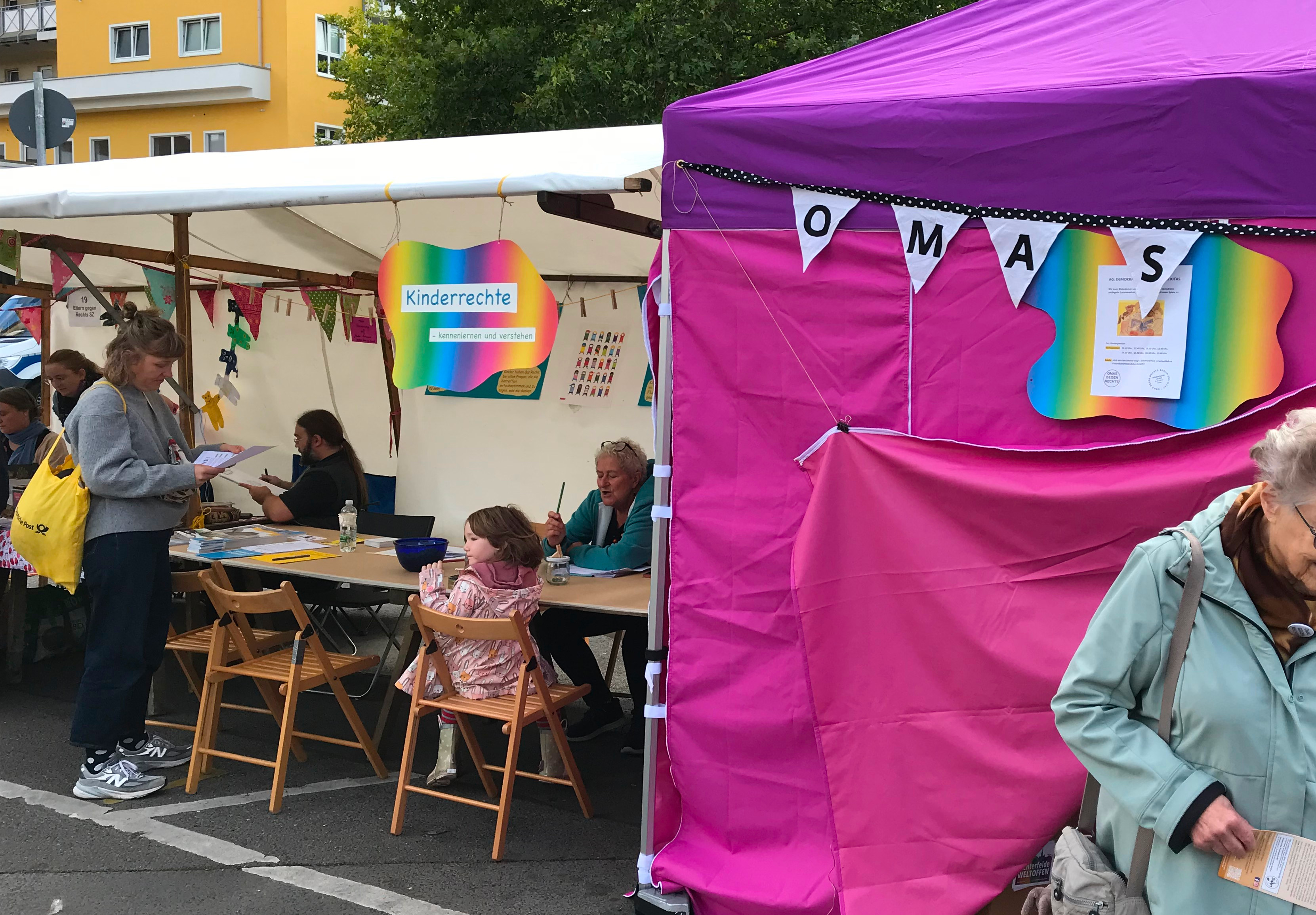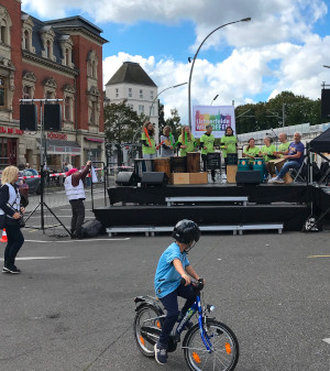 Gestern waren wir zum Internationalen Tag der Demokratie in Berlin-Lichterfelde auf dem Kranoldplatz bei einem Demokratiefest. Von 12:00 bis 16:00 Uhr wurde mit dem Demokratiefest in schwierigen Zeiten ein positives Signal gesetzt. Die Menschen im Kiez kamen zusammen und ins Gespräch. Neben vielen interessanten Infoständen gab es ein umfangreiches, buntes Programm mit Reden und Musik. Viele Initiativen konnten ihre speziellen Themen vorstellen. Es gab Kunst und Spaß in einem Kinderbereich. Das Bild rechts zur Eröffnung des Festes, um lautstark Besucher anzulocken ... Die Veranstalter, die Initiative Lichterfelde WELTOFFEN, ist seit Anfang 2023 aktiv. Als engagierte Bürgerinnen setzen sie sich für die Stärkung unserer Demokratie ein und bemühen sich um offenen Meinungsaustausch und informierte Debatten. Davon lebt unsere Demokratie. Auf vielen Schautafeln wurden die Probleme im Kiez angesprochen aber auch auf die der Vergangenheit hingewiesen. Nie wieder ist jetzt!