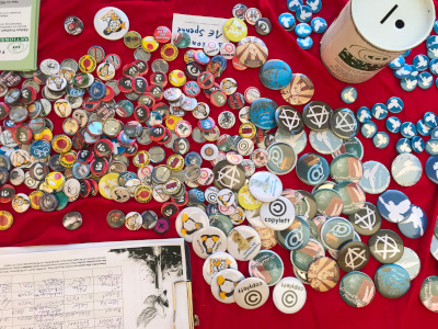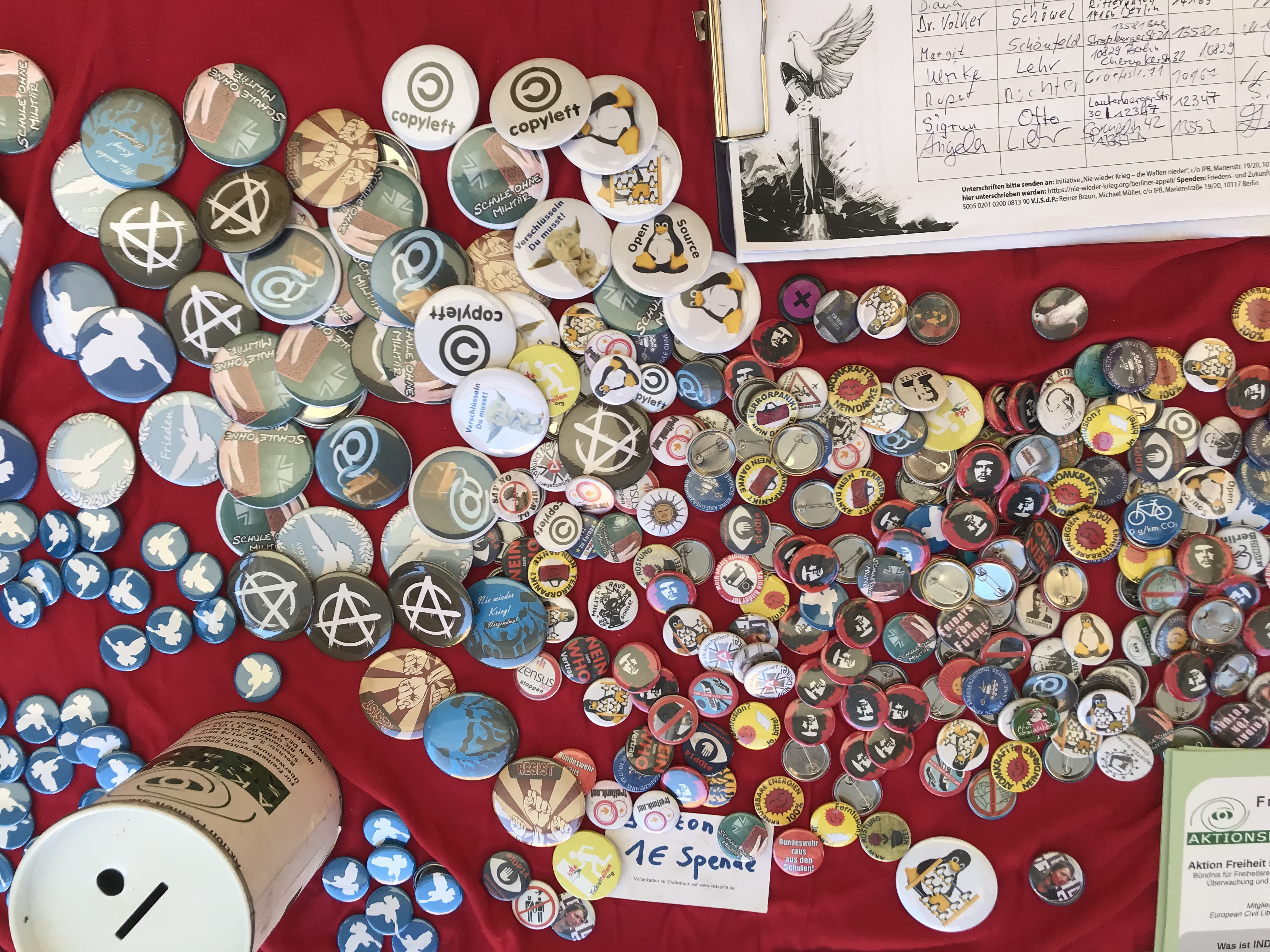 Neben vielen Buttons und Informationsmaterial zu unseren Themen hatten wir auch wieder ein Exemplar der Drohnen-Quilts dabei, Decken im Angedenken an über 300 namentlich bekannte Kinder, die durch US Drohnen in Afghanistan, Pakistan, dem Irak und Jemen getötet wurden.