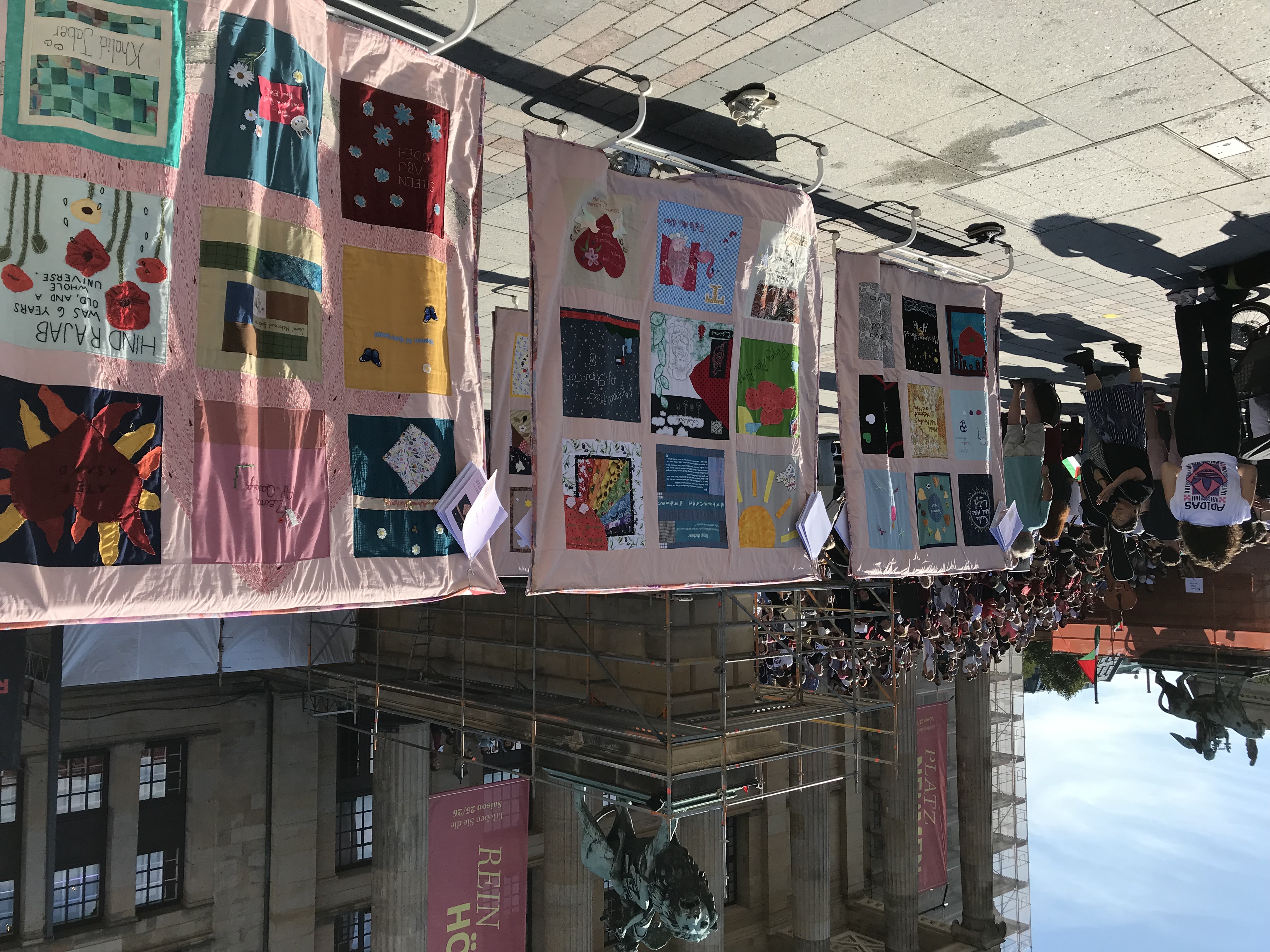12:00 – ca. 13:30 Uhr: Großes Flashmob-Konzert mit Chor und Orchester: klassische und arabische Musik – alle Instrumente und Stimmen willkommen. Mit dabei sind Grieving Doves und Children Of Gaza Quilt