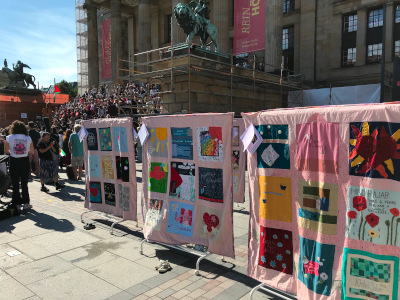 Während bei unseren Drohnen-Quilts beim Tag der Zivilcourage am Freitag ein Quilt-Element für ein ermordetes Kind stand, symbolisieren bei den hier gezeigten Quilts jedes Element 10 getötete Kinder. Unicef.de spricht von mehr als 50.000 getöteten oder verletzten Kindern in Gaza.