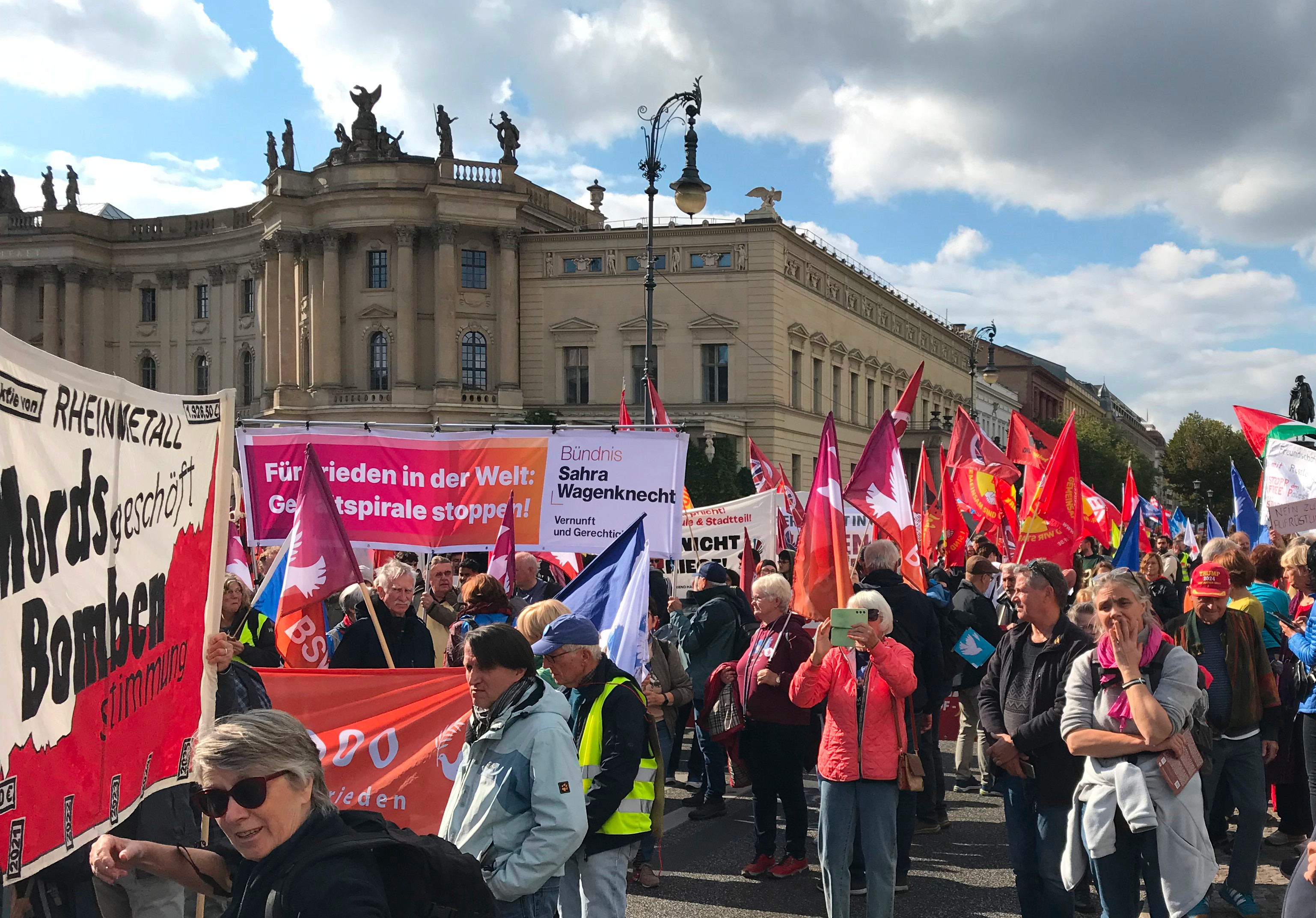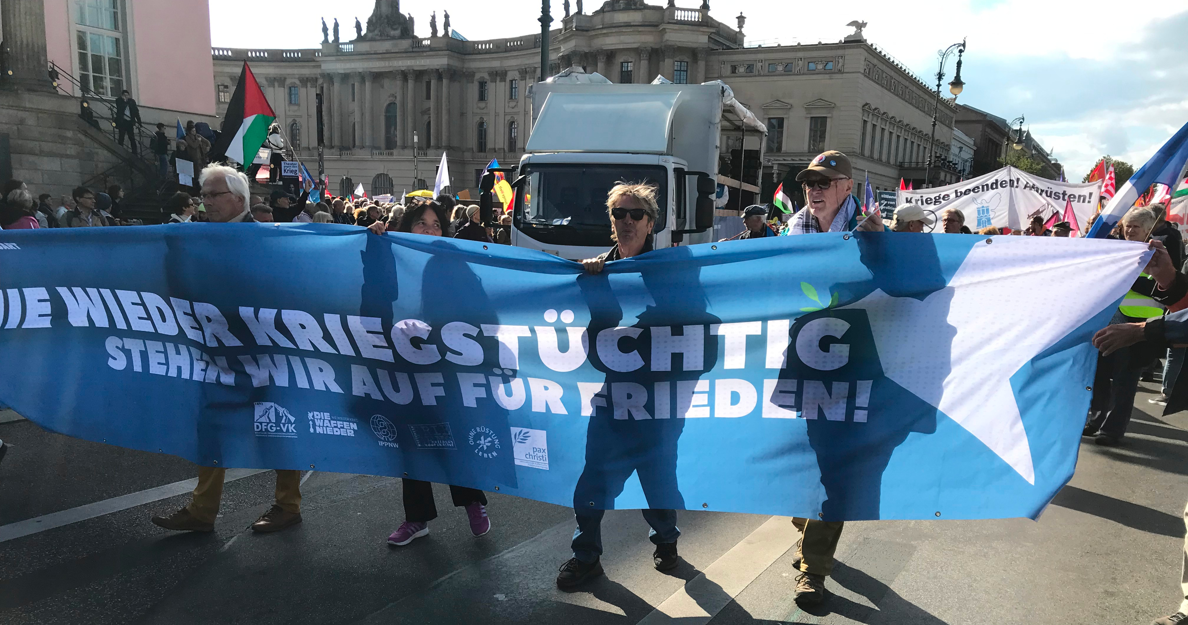 sagte auf der Berliner Kundgebung der SPD Bundestagsabgeordnete Ralf Stegner und mahnte dringend eine andere Politik an: "Deutschland muss friedensfähig werden, nicht kriegstüchtig." Neben Jürgen Grässlin ergriffen auch Kriegsdienstverweigerer aus der Ukraine und Russland das Wort.