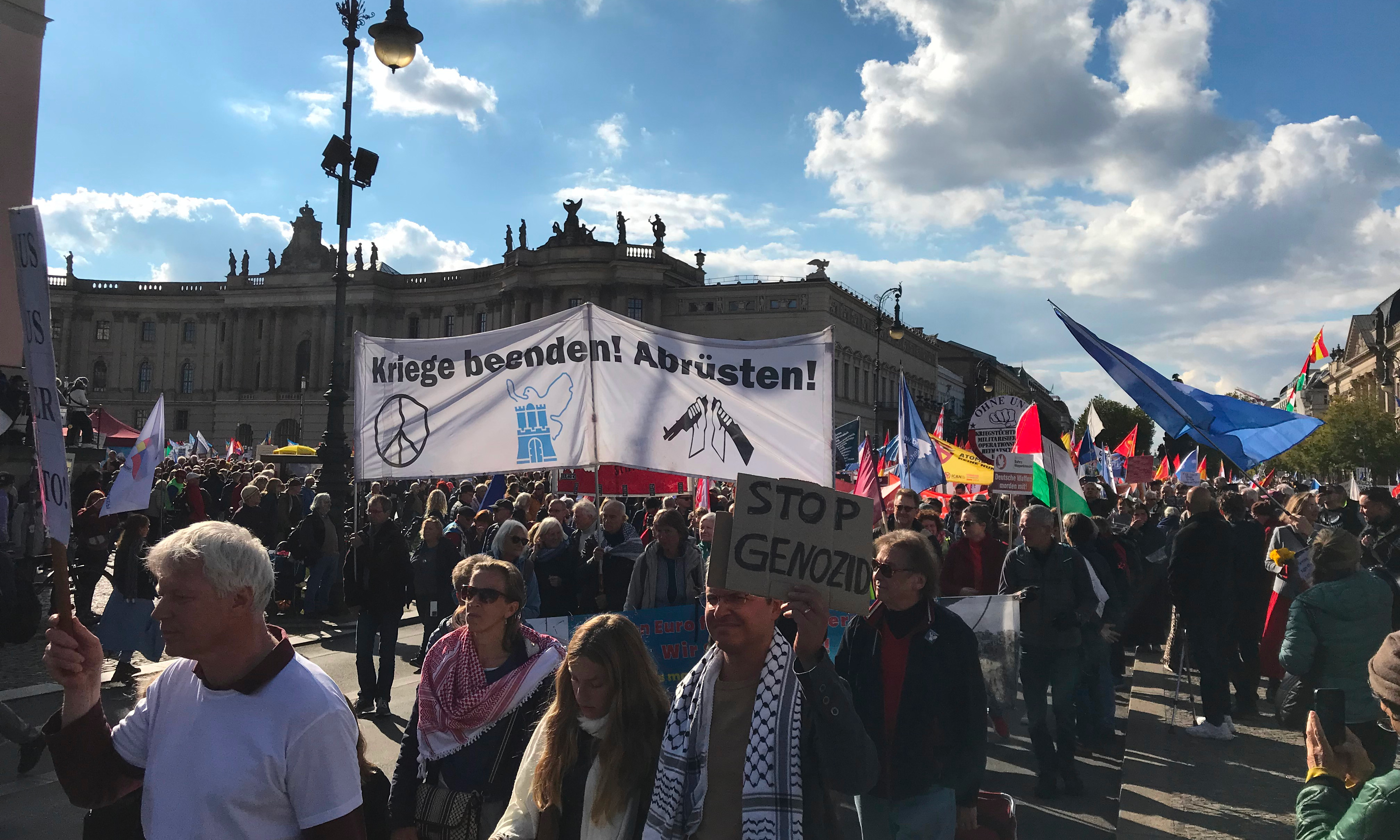 Mehr als 20.000 Menschen versammelten sich gestern auf dem Bebelplatz in Berlin zu einer Kundgebung und anschließender Demo durch das Regierungsviertel und zurück zum Bebelplatz. 450 Gruppen, darunter auch wir, Aktion Freiheit statt Angst e.V. hatten zu Demos für den Frieden in Berlin und Stuttgart aufgerufen. Wir hatten unseren nicht mehr ganz neuen Bundeswehr-Flyer dabei, der sich gegen Auslandseinsätze der Bundeswehr richtet und konnten dafür viele Abnehmer finden.
