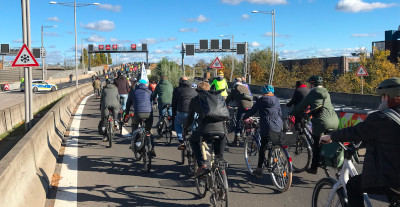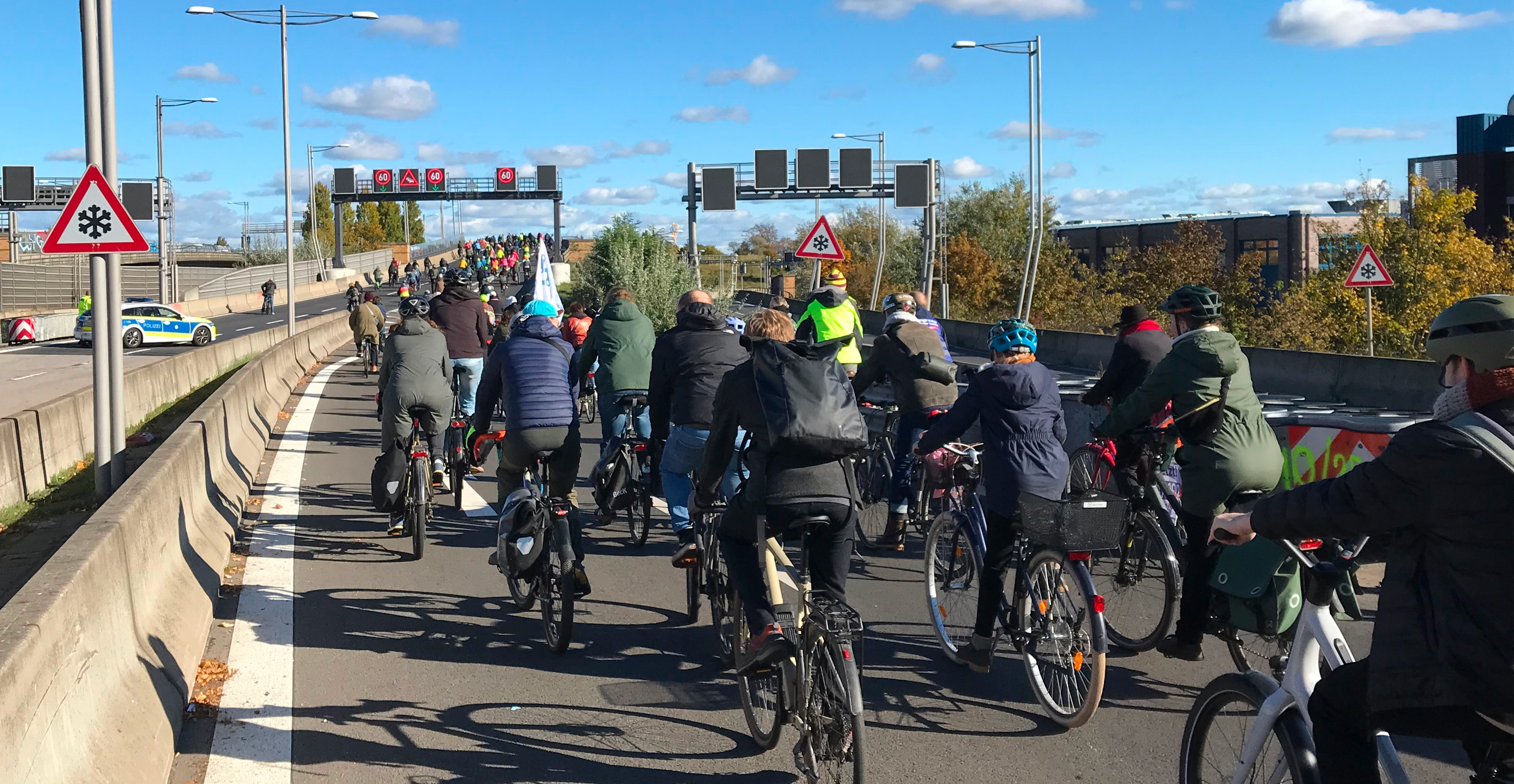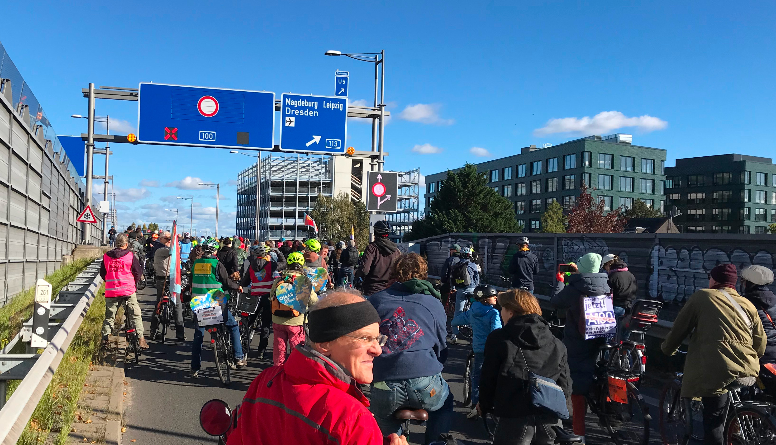 Gestern konnte der südliche Teil des Berliner Stadtrings A100 für den Nachmittag vom Autoverkehr befreit werden. Über 1000 Menschen, meist mit dem Fahrrad konnten diese riesigen Flächen einmal ohne die tägliche Blechlawine besichtigen. Changing Cities, Critical Mass, Senior Mass und weitere NGOs, die sich für Klimaschutz und eine andere Verkehrspolitik im Sinne der Mehrheit der Menschen einsetzt hatten zu Kundgebungen vor und auf der Autobahn aufgerufen. Aktion Freiheit statt Angst e.V. war mit mehreren Aktiven dabei.