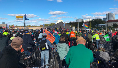 Unter dieser Forderung bewegten sich 3 Demozüge zu Fuß und auf dem Rad durch Tempelhof und Neukölln nach Treptow. Der Anlass war die teuerste Autobahn Deutschlands: Für 1 Million Euro pro Meter wurde im Sommer der 16. Bauabschnitt der A100 eröffnet. Er bringt den Dauerstau von Neukölln nach Treptow vor die Elsenbrücke. Dort soll jetzt sogar ein Radweg geopfert werden, um den Autos eine Spur mehr zum Stau-Stehen zu geben. Auch der dortige ehemals flüssige Busverkehr steht nun im Dauerstau.