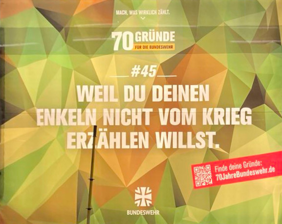 Neben dem Widerstand gegen die aktuelle "Kriegstüchtigkeit" ist leider auch wieder wichtig, die "kleinen Tipps und Tricks" zur Vermeidung einer Einberufung aus den Analen der bundesdeutschen Geschichte herauszukramen. Denn während sich die Bundeswehr mit der nebenstehenden Grafik geschichtsvergessen in Szene zu setzen versucht, gibt es noch viele Menschen, die sich noch gut an ihren "Kampf" mit der Musterung bis zu Verweigerung erinnern können.