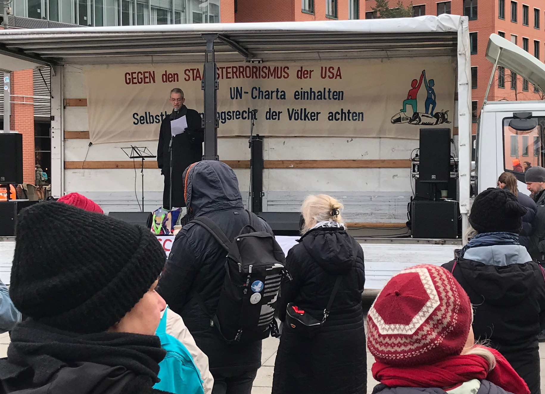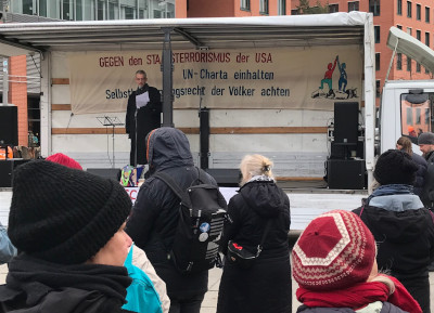 Gegen Kriegstreiberei und Staatsterrorismus der USA Auch anlässlich der Münchner Sicherheitskonferenz fand in Berlin zeitgleich mit der auch von Aktion Freiheit statt Angst e.V. unterstützten Anti-Siko-Demo auf dem Stachus in München, hier auf dem Potsdamer Platz eine Friedenskundgebung statt. Auch unsere Aktiven waren dabei. Weitere Kundgebungen gab es auf dem Gänsemarkt in Hamburg, am Brockhaus-Brunnen auf der Zeil in Frankfurt/M und an der Heiliggeistkirche in Heidelberg. Für die Verwirklichung der UN Charta und das Selbstbestimmungsrecht der Völker - Stoppt den Staatsterrorismus der USAWährend sich die kalten Krieger in München gegenseitig bejubeln geht die Friedensbewegung mit den unter ihren Kriegen leidenden Menschen auf die Straße. Die Außenpolitik der USA, die aus Erpressung, Entführung, Sanktionen, direkten Kriegshandlungen bis hin zum Versuch des Aushungern von sich nicht unterwerfenden Ländern besteht, bedroht nicht nur die Länder Lateinamerikas, allen voran Kuba, sondern darüber hinaus auch ganz aktuell den Iran und Grönland, sowie alle Länder, die sich ihrem Vormachtanspruch nicht beugen wollen. Dagegen stellen sich Friedens- und Solidaritätsbewegung gemeinsam. Weil gerade in München die alljährliche Sicherheitskonferenz tagt, haben wir den 14.2. ausgewählt, in mehreren Städten auf die Straße zu gehen, um gegen diese Hegemonialpolitik der USA, die von der EU und der deutschen Regierung gefördert wird, zu protestieren. Nach dem völkerrechtswidrigen Überfall auf Venezuela - Tötung von mehr als 80 Venezulanern und der Entführung des Präsidenten und seiner Frau - richtet sich jetzt die US Kriegsmaschine gegen Cuba. Das Land unterliegt durch die ebenfalls völkerrechtswidrige Blockade von Ölimporten faktisch einem Stillstand des motorisierten Verkehr und ständigen Stromabschaltungen. Seit Jahren fordert die UN Vollversammlung mit großer Mehrheit - zuletzt bei nur 2 Gegenstimmen (USA und Israel) - die Aufhebung der US Sanktionen. Für das Völkerrecht und die Souveränität der Staaten! NEIN zum Krieg! Mehr dazu bei https://frikoberlin.de/ Kategorie[18]: Pressemitteilungen Short-Link dieser Seite: a-fsa.de/d/3N3 Link zu dieser Seite: https://www.a-fsa.de/de/articles/9440-20260215-.html Link im Tor-Netzwerk: http://a6pdp5vmmw4zm5tifrc3qo2pyz7mvnk4zzimpesnckvzinubzmioddad.onion/de/articles/9440-20260215-.html Tags: #AntiSiko #München #Sicherheitskonferenz #Demo #Sanktionen #Staatsterror #USA #Cuba #Venezuela #SchuleohneMilitär #Atomwaffen Erstellt: 2026-02-15 09:16:02 Kommentar abgeben |
