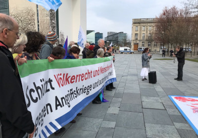 Für die anwesenden Pressevertreter ist dann im Laufe der Aktion vor dem Bundeskanzleramt ein Aktivist mit der Maske von Bundeskanzlers März mit blutverschmierten Schuhen symbolisch auf dem Völkerrecht herum gestapft. Auch wenn die Aktion sehr fotogen war, so ist doch zu bedauern, dass nicht mehr friedenbewegte Menschen zu der Aktion erschienen sind als uns die Staatsmacht an Polizisten beschert hat. Vermutlich war die Anzahl der Polizisten sogar noch größer, da insgesamt vier Polizeiwannen vor Ort waren aus denen niemand ausgestiegen ist. Dieser Mangel an friedensbewegten Menschen kann aber heute um 15:30 Uhr am Neptunbrunnen am Fernsehturm natürlich getoppt werden. Die Friedenskoordination Berlin (frikoberlin.de) hat dazu aufgerufen, auch dort gegen den Krieg und die Kriegsbereitschaft zu protestieren. Auch dort werden wir wieder darauf hinweisen, dass die das Völkerrecht verletzenden Kriegstreiber in den USA sitzen.
