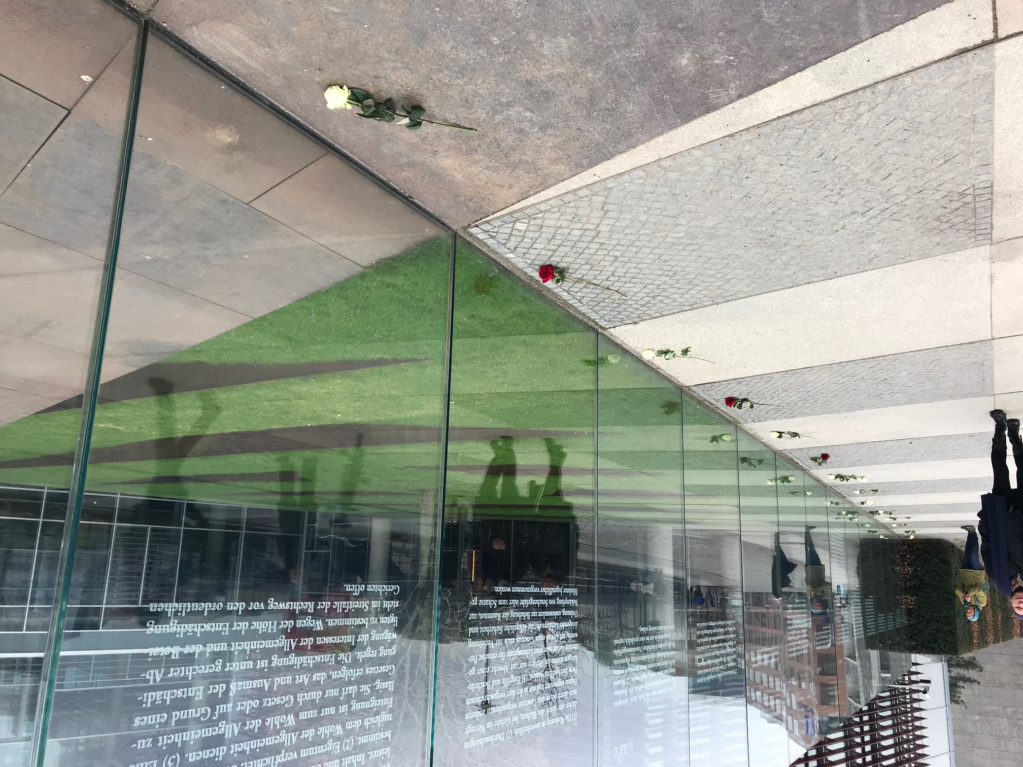 Inmitten der Glassäule soll der Text des Artikels 20 gelasert schweben. Von vorne