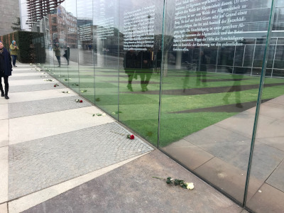 Zum Frühlingsbeginn haben wir gestern Vormittag am Spreeufer hinter dem Bundestag mit mehreren Besuchern der Vernichtung der Stele mit dem Artikel 20 GG gedacht. Am Kunstwerk von Dani Karavan mit den Artikeln 1-19 GG sollte die von der Künstlergruppe des "Verein zur Erneuerung der Bundesrepublik an ihren eigenen Idealen" geschaffene Stele in Gold auf Buche mit dem Artikel 20 GG stehen.